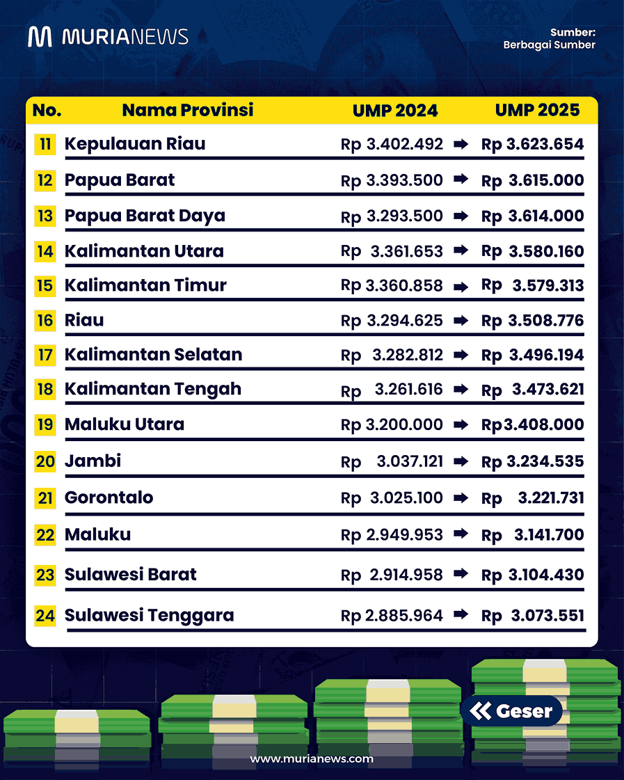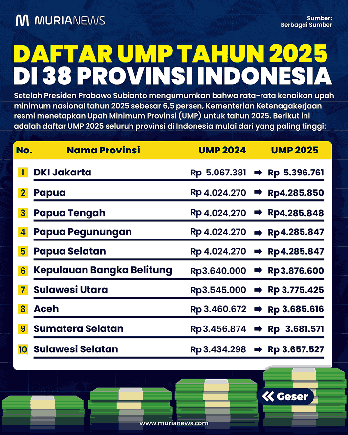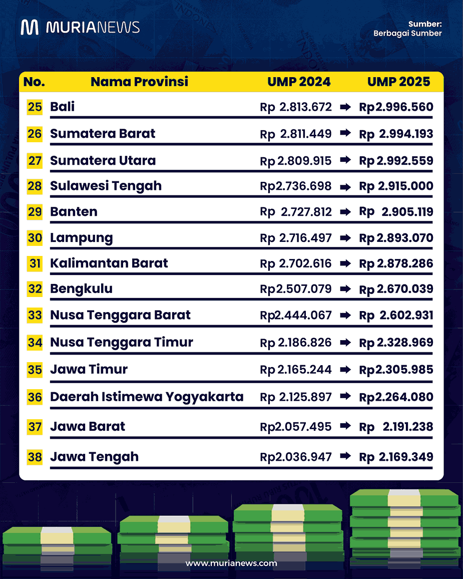 Berikut daftar lengkap UMP 2025 di 38 provinsi Indonesia: