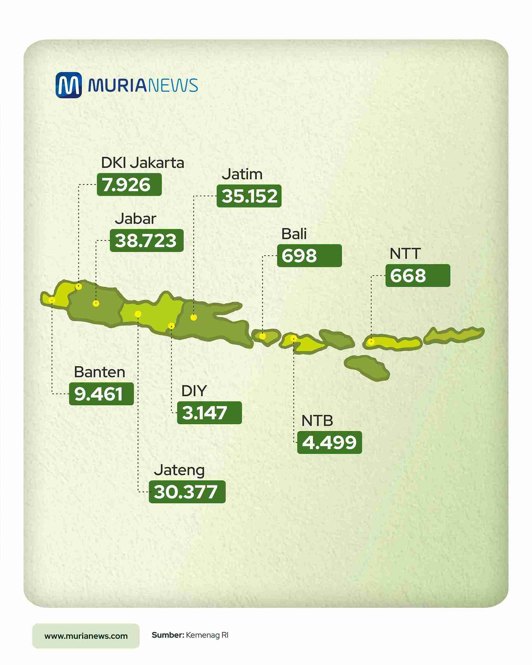 Dari jumlah tersebut, Jawa Barat (Jabar) mendapatkan kuota terbanyak, yakni 38.723 jemaah haji. Kemudian diikuti Jawa Timur (Jatim) sebanyak 35.152 jemaah haji dan Jawa Tengah (Jateng), 30.377 jemaah haji.