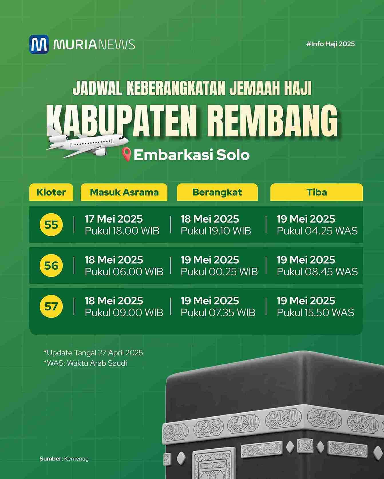 Murianews, Rembang – Jadwal keberangkatan jemaah haji Rembang telah dirilis. Rilis jadwal keberangkatan itu berdasarkan surat edaran Kemenag bernomor: 26.001/Kw.11.5/2/HJ.00/04/2025.