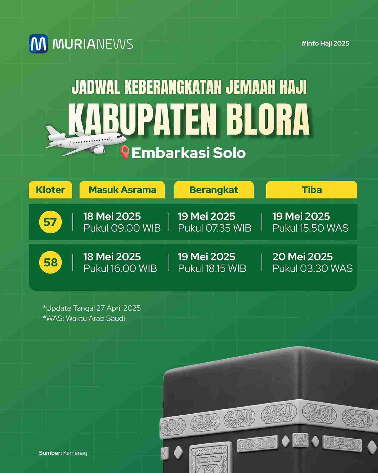 Berdasarkan SE Kemenag bernomor: 26.001/Kw.11.5/2/HJ.00/04/2025 tentang Jadwal Kloter Jemaah Haji Embarkasi Solo 1446H/2025 M, jemaah haji Blora dibagi menjadi dua kloter, yakni 57 dan 58.
